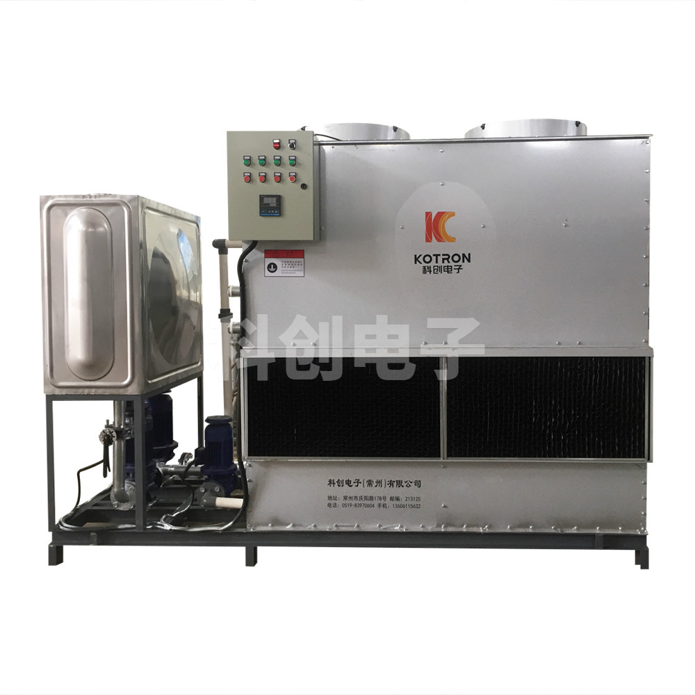 1.閉式循環(huán)水冷卻系統(tǒng)原理介紹:冷卻系統(tǒng)工作過程中,冷卻介質(zhì)(軟水、淬火液)由主循環(huán)泵驅(qū)動在換熱器(紫銅冷凝器)及需冷卻設(shè)備(如:電源、冷卻工件等)之間循環(huán)流動;噴淋水均勻地噴灑在換熱器上,在換熱器外表面形成均勻的水膜,冷空氣由塔體下方的進(jìn)風(fēng)口進(jìn)入系統(tǒng)主題內(nèi),與噴淋水逆流經(jīng)過換熱器表面,在此過程中有兩種換熱方式,即冷空氣與冷卻介質(zhì)之間的熱傳導(dǎo)和噴淋水蒸發(fā)吸熱的熱交換,吸收熱量后的飽和熱濕空氣由風(fēng)機(jī)排至大氣中,其余的噴淋水流入塔體下部的水槽,由水泵再輸送至噴淋系統(tǒng)。如此往復(fù),換熱器內(nèi)的冷卻介質(zhì)得到降溫冷卻。